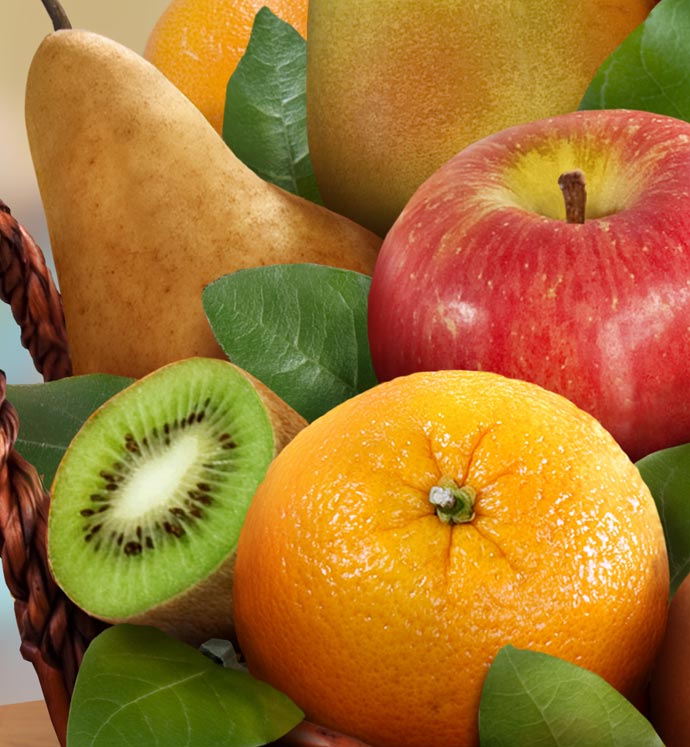 Send sweet California sunshine their way with this hand-woven, sturdy wicker gift basket filled with Beurre Bosc, Red Sensation and Imperial Comice Pears, plus Fuji and Granny Smith Apples, Navel Oranges, Kiwi and more!  Kosher, OU