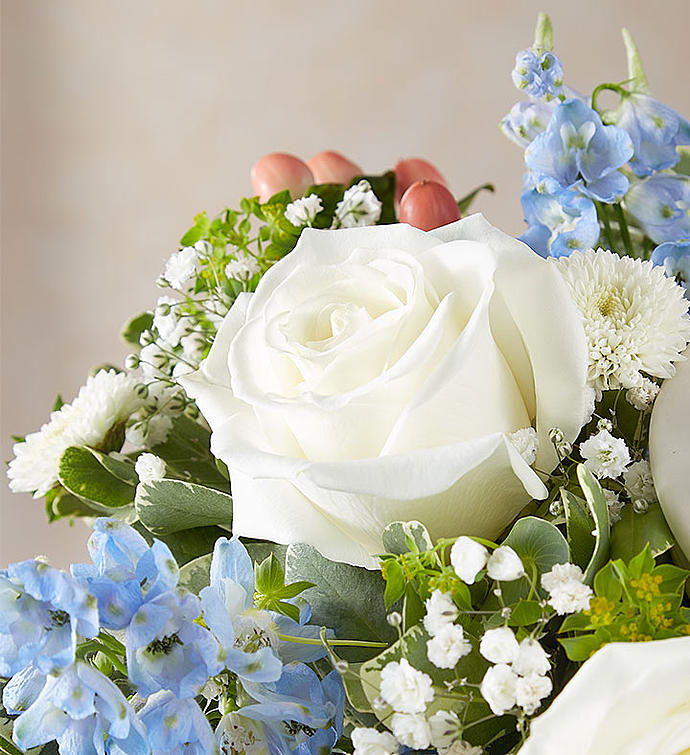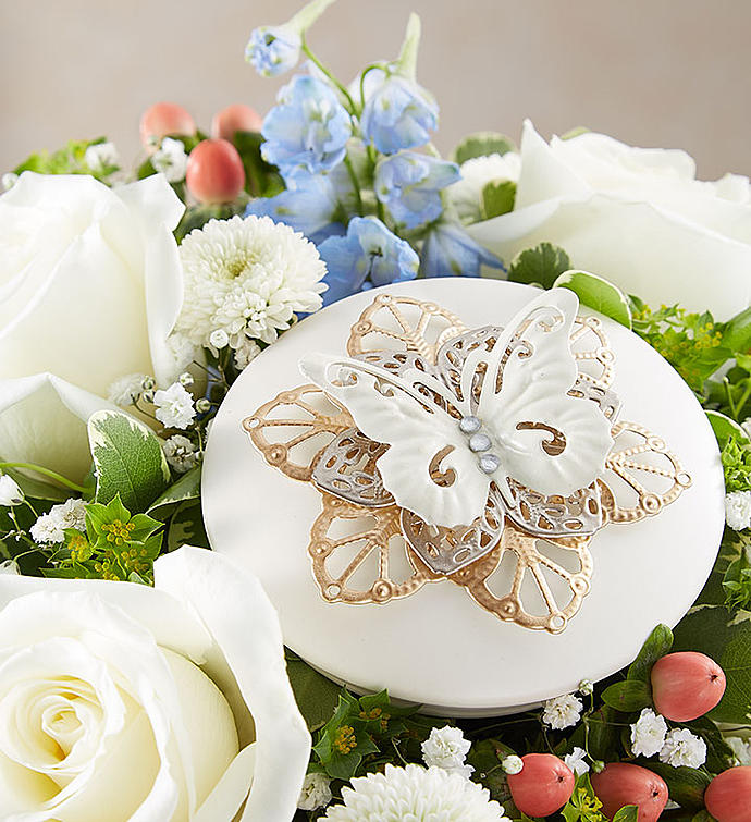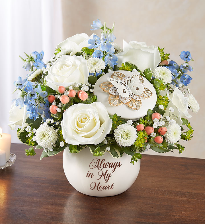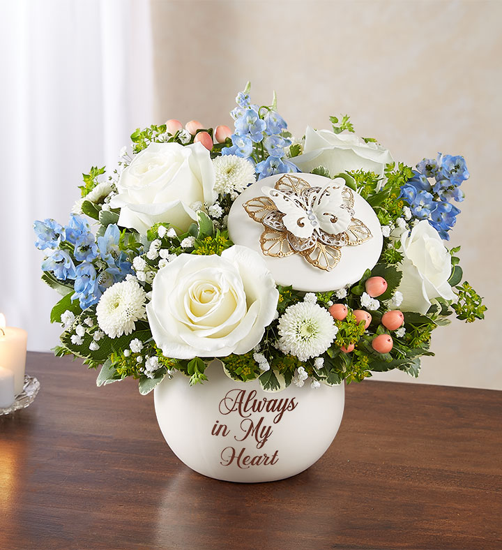 EXCLUSIVE A thoughtful tribute for someone who is always in your heart. Our bouquet of soothing blue and white blooms is hand-gathered in our elegant keepsake container. A special place for keeping mementos, it’s embellished with a beautiful butterfly—the symbol of hope and eternal life—and inscribed with the sentiment, “Always in My Heart.” It’s a touching gift that will let them cherish the memories of a loved one forever.