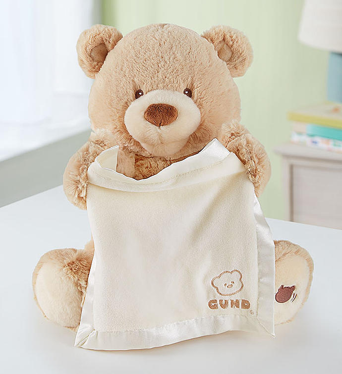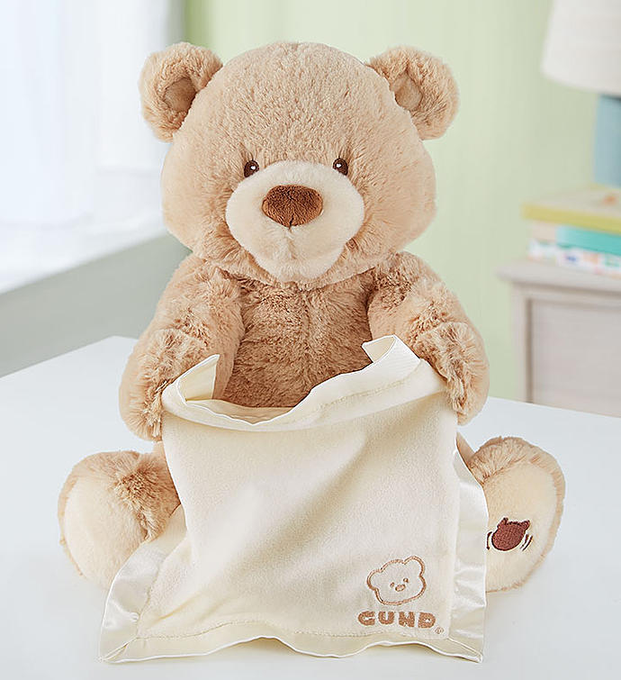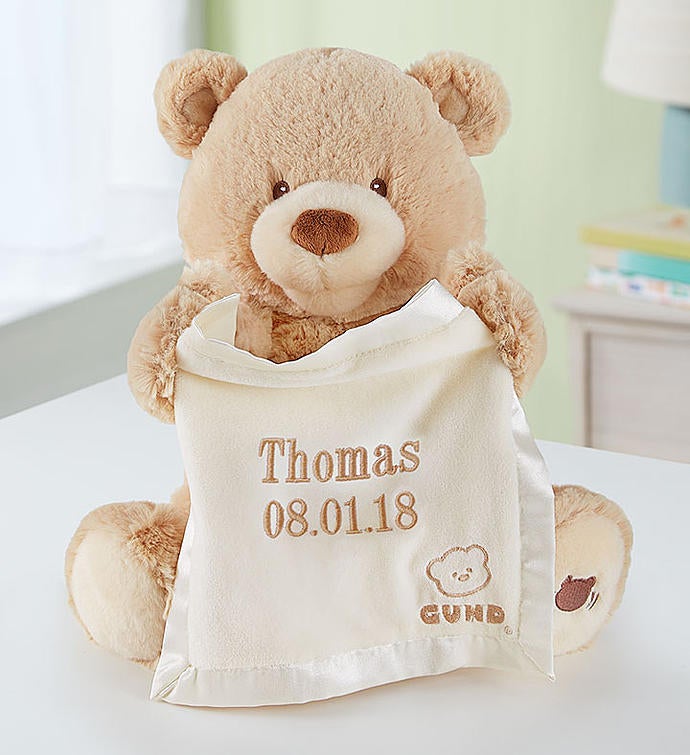 Peek-a-boo, this bear sees you…and little ones will have a ball playing their favorite game with him! Just push the button on his foot and the cuddly Gund® bear comes to life, raising and lowering the blanket to say "peek-a-boo!” He even helps with toddlers’ developmental and interactional skills. But the best part is, you can add a custom message to create an extra special new baby or birthday gift.