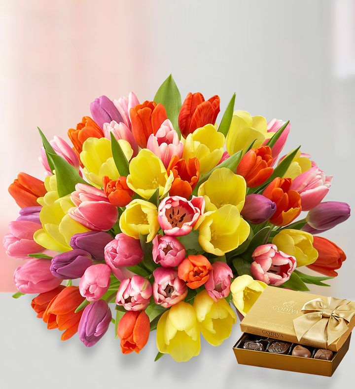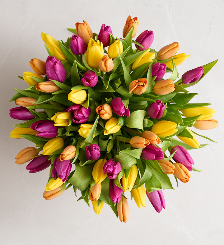 Make someone happy in a big way with our spectacular tulip bouquet. A rainbow of blooms, 60 in all, brings the excitement of spring to those you care about for big celebrations, out-of-the-blue surprises and every moment in-between.