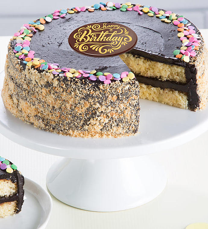 This is the perfect cake for the ultimate birthday celebration. Gourmet dessert lovers will adore the amazing blend of yellow cake, vanilla whipped filling and sweet vanilla bean frosting. This two-layered cake is topped with decorative rainbow confetti sprinkles on top and all around the sides! Includes a festive chocolate Happy Birthday plaque and arrives in an elegant gift box.