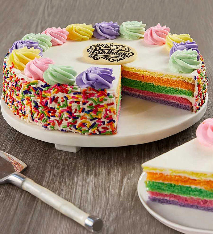 The wizards have created a magical cake for the ultimate birthday celebration. Gourmet dessert lovers will adore the amazing 5 colorful fruity flavored cake layers. The cake is then covered with a delicious creamy white frosting and topped with a colorful array of frosting dollops and a tasty Birthday plaque. Confetti sprinkles complement the rainbow of colors! Arrives in an elegant gift box. Kof-K Kosher Dairy