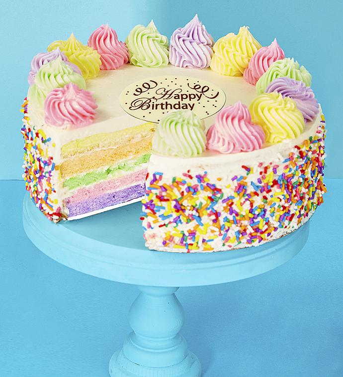 The wizards have created a magical cake for the ultimate birthday celebration. Gourmet dessert lovers will adore the amazing 5 colorful fruity flavored cake layers. The cake is then covered with a delicious creamy white frosting and topped with a colorful array of frosting dollops and a tasty Birthday plaque. Confetti sprinkles complement the rainbow of colors! Arrives in an elegant gift box. Kof-K Kosher Dairy