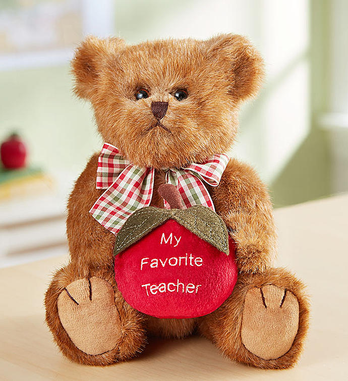 · Bearington®Beary Best Teacher teddy with plaid ribbon holds an oversized plush apple that reads “My Favorite Teacher”; features an apple scent