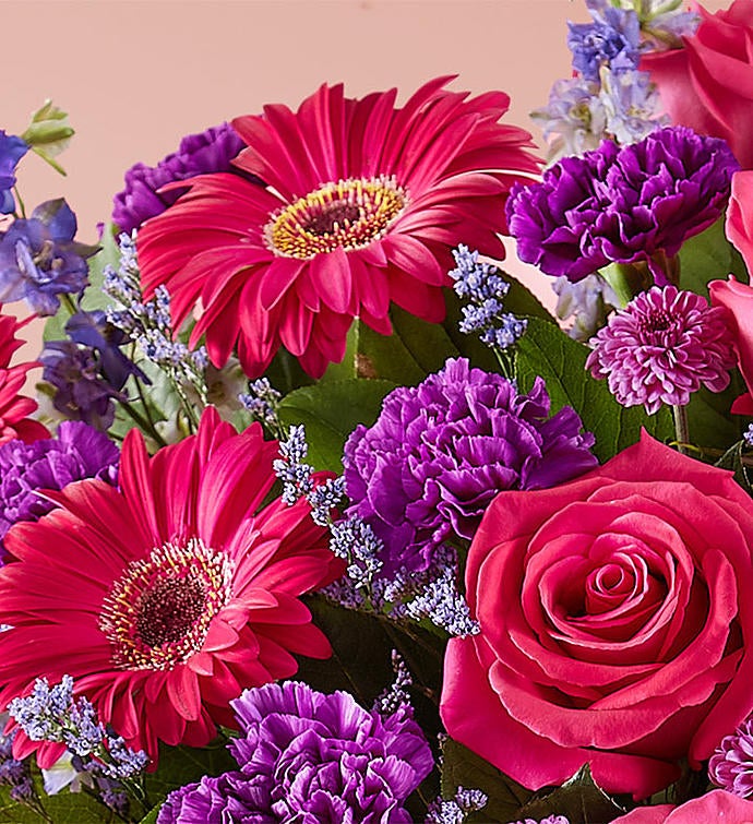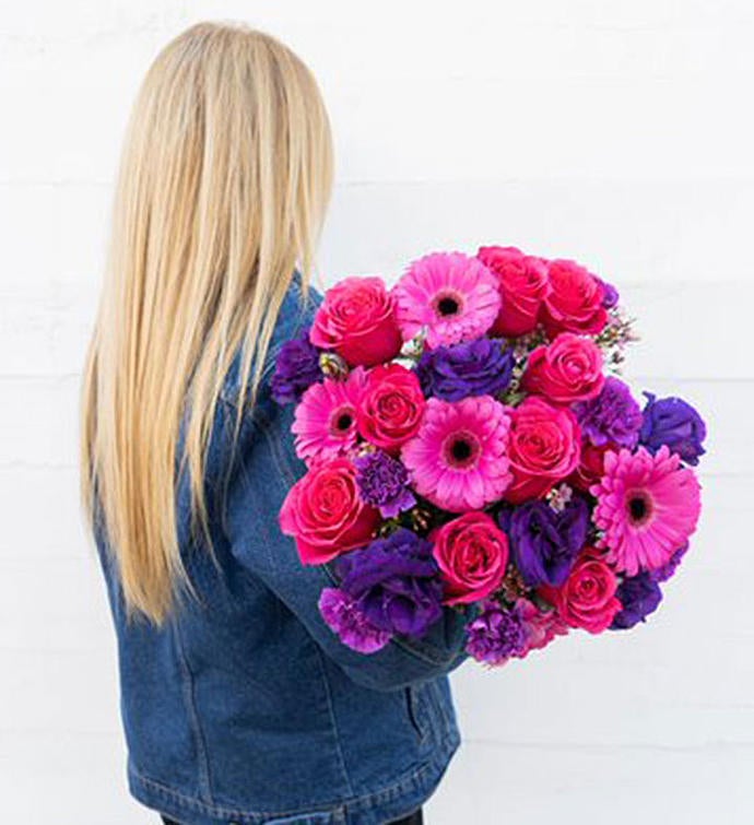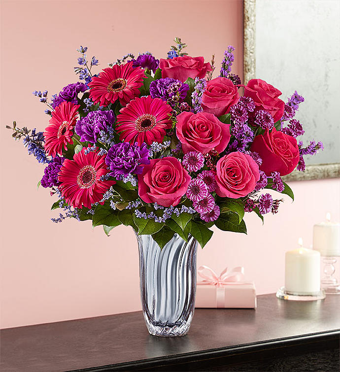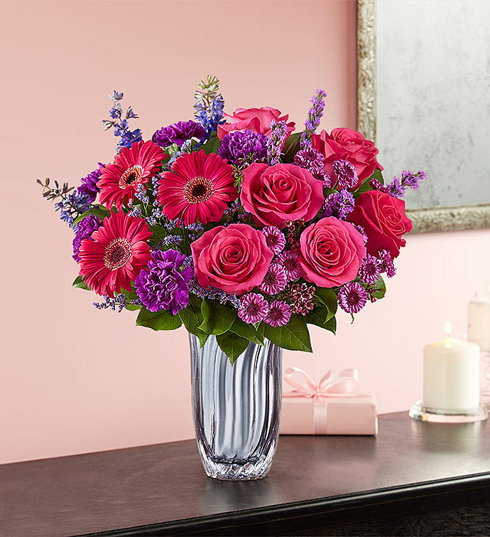 For your one and only, a gorgeous gathering that says, “I’m glad you’re mine.” Our show-stopping arrangement of vibrant pinks and passionate purples in a truly unique asymmetrical design, it arrives in our sparkling Silver Radiance Vase for a spectacular display of your affection. A bouquet like this will leave no doubt as to just how you feel.