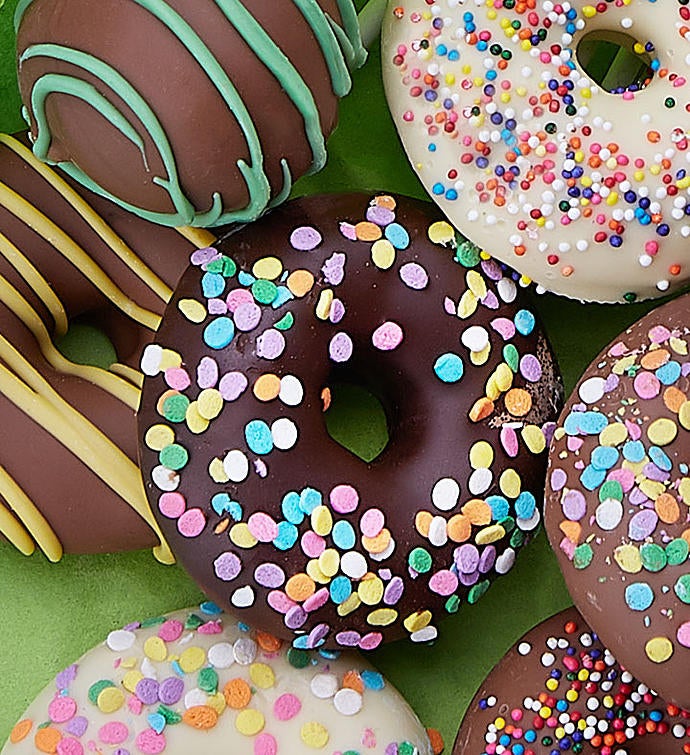 Send a delicious and unique Birthday greeting to a special someone with this adorable "bouquet" of seven Belgian Chocolate Covered Mini Donuts and three Cake Pops. Each scrumptious delight is hand decorated with Belgian Chocolate, Drizzles & Candy Toppings. Truly a memorable gift!