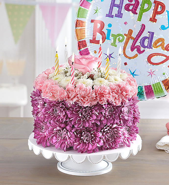 EXCLUSIVE No matter how you slice it, our Birthday Wishes Flower Cake will make their day! Handcrafted from carnations and poms in soft hues of pink, lavender, and white, it’s a one-of-a-kind centerpiece for a memorable celebration. Want to make the day even more special? A birthday balloon will take the fun to new heights!
