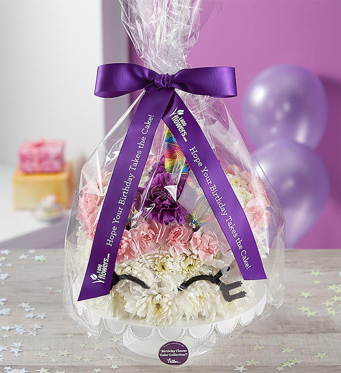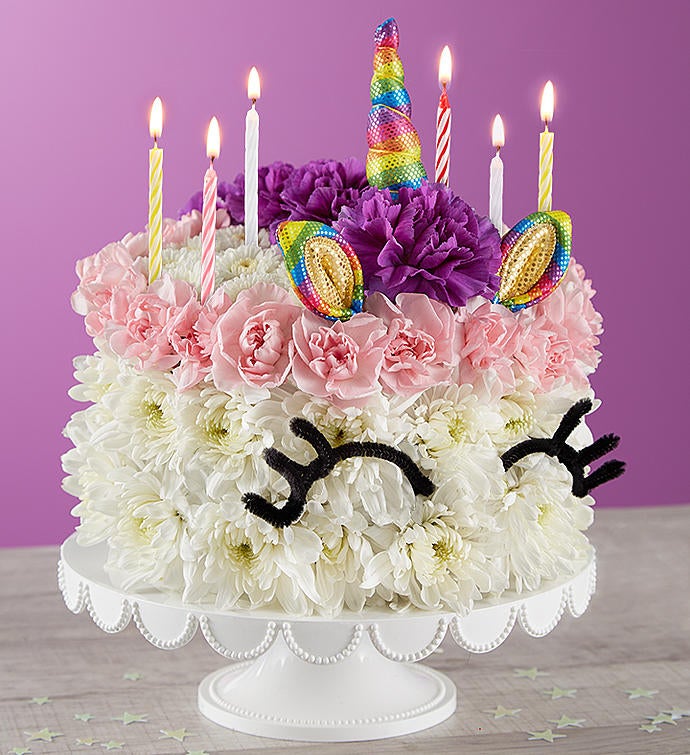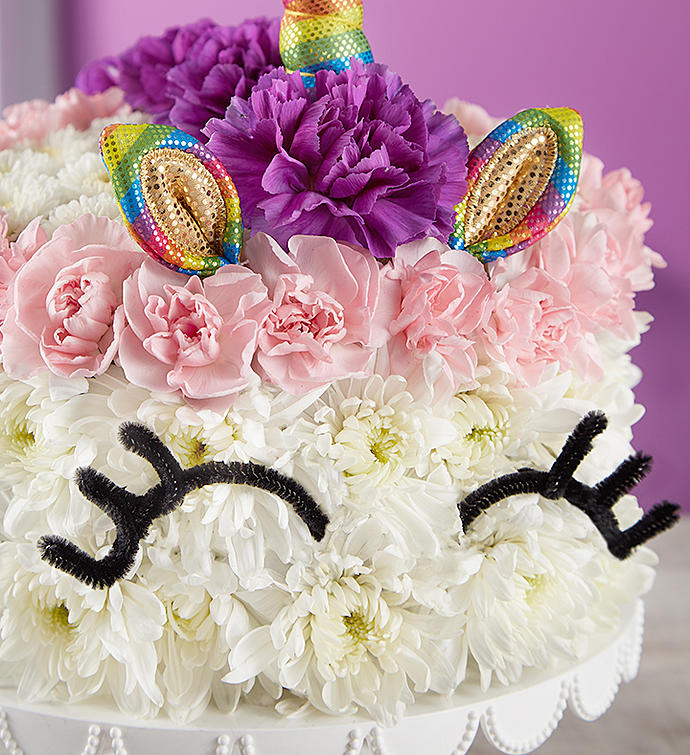 EXCLUSIVE From its twirly rainbow horn to its sweet eyelashes and mane, our unicorn flower cake is nothing short of magical! The latest from our truly original collection, this whimsical creation is crafted from a mix of white, pink and lavender blooms. Sitting pretty on a pedestal stand, it’s a whimsical gift that’ll make all their birthday wishes come true—no matter what year they’re celebrating.