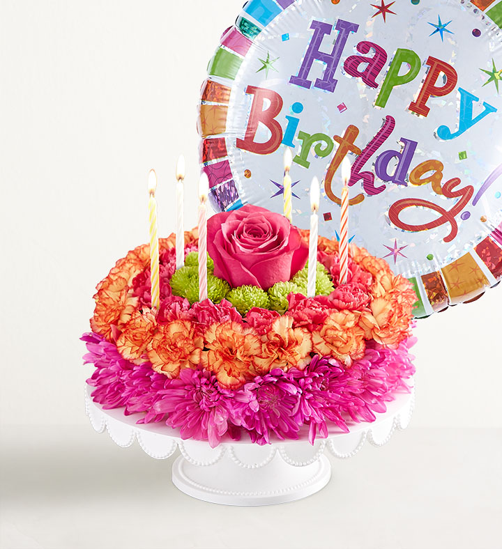 EXCLUSIVE If you want their birthday to be the brightest day of the year, your wish has come true! Our vibrant new flower cake has all the ingredients for a happy celebration: hot pink and fiery orange blooms—and candles to top it off. This confection-inspired creation is the perfect centerpiece for their party. Dial up the fun by adding a balloon to your gift.