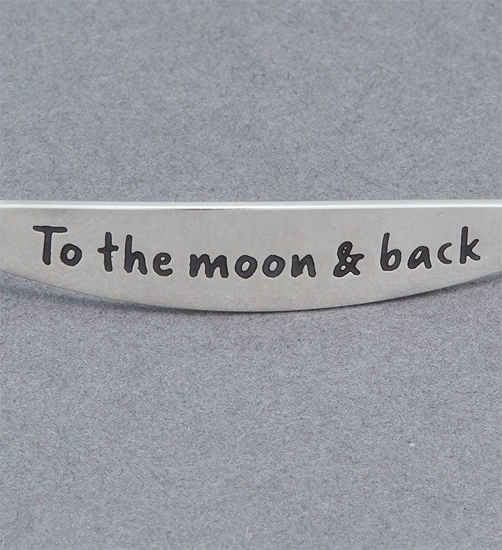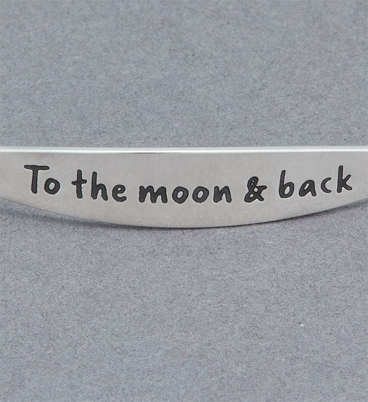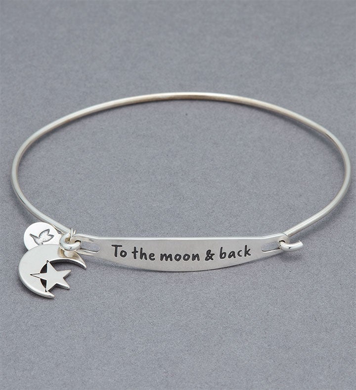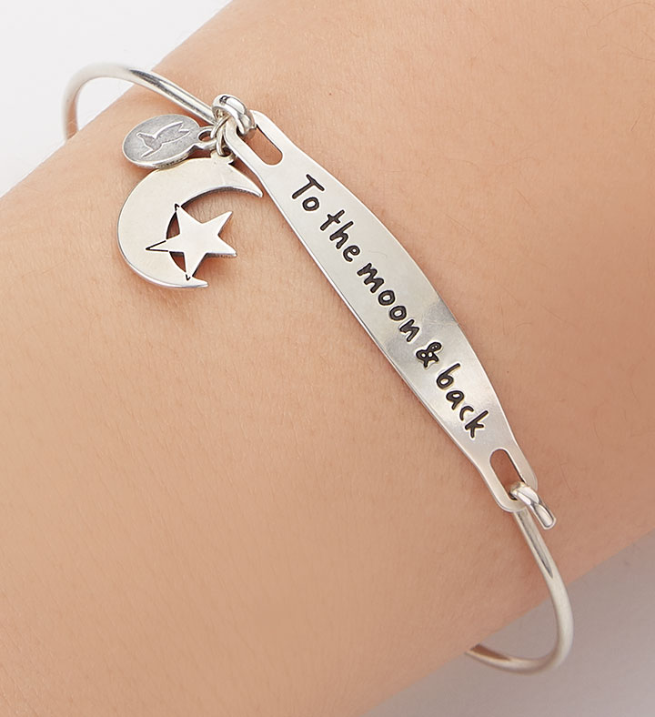 Celebrate a love that’s limitless with our beautiful Chamilia bracelet. The lightweight sterling silver bangle features the sweet sentiment “To the moon & back” and includes a moon & star charm. It’s an out-of-this-world romantic gesture for birthdays, anniversaries or just because.