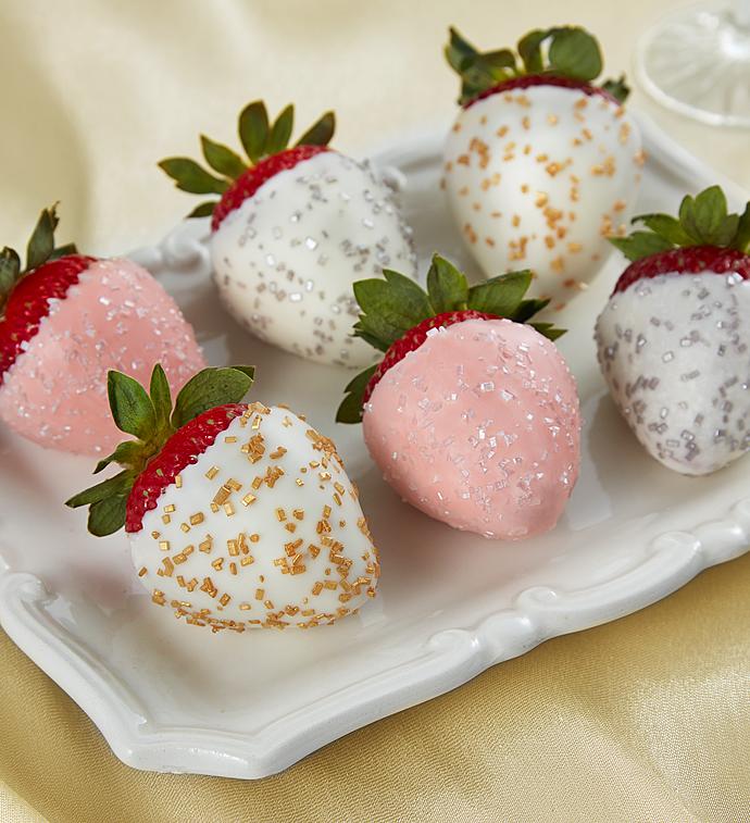 In this lavish collection, each giant, hand-picked strawberry comes generously dipped in creamy white and pink champagne-infused real chocolate and decoratively sprinkled with gold, platinum and clear sugar.