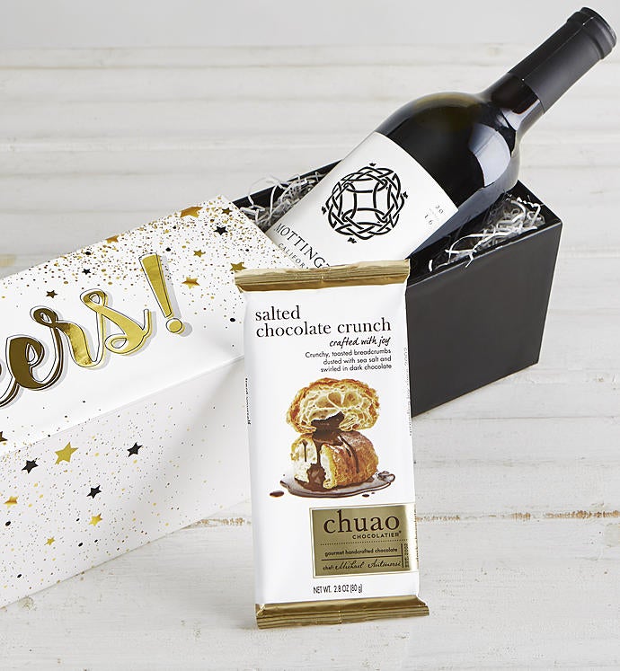 This gift is the perfect way to celebrate any occasion by saying "Cheers!" Make their moment special by sending this sweet gift box that is worth celebrating for! This fun keepsake slider box is filled with Mottington Merlot Wine and paired with a Chuao® chocolate bar. This gift will surely put that special someone in the mood to celebrate!