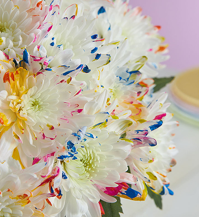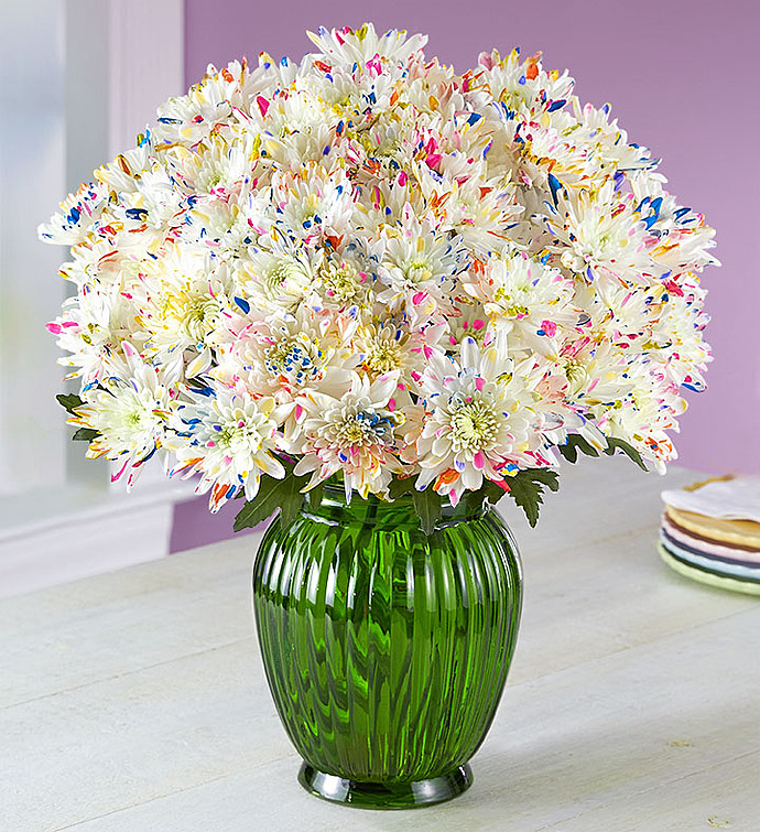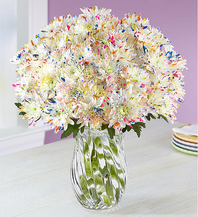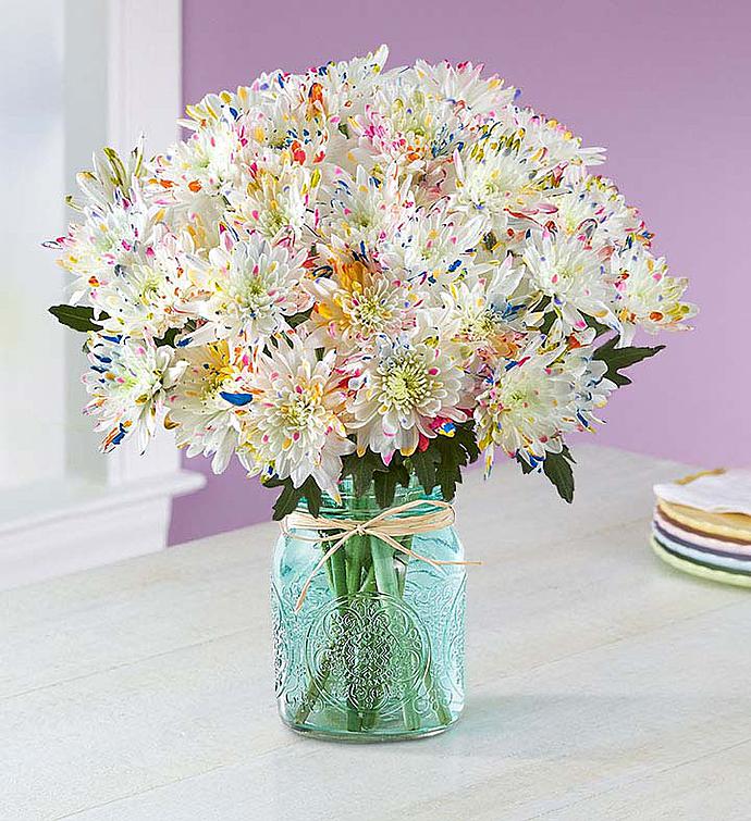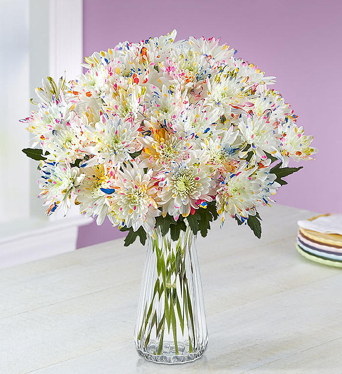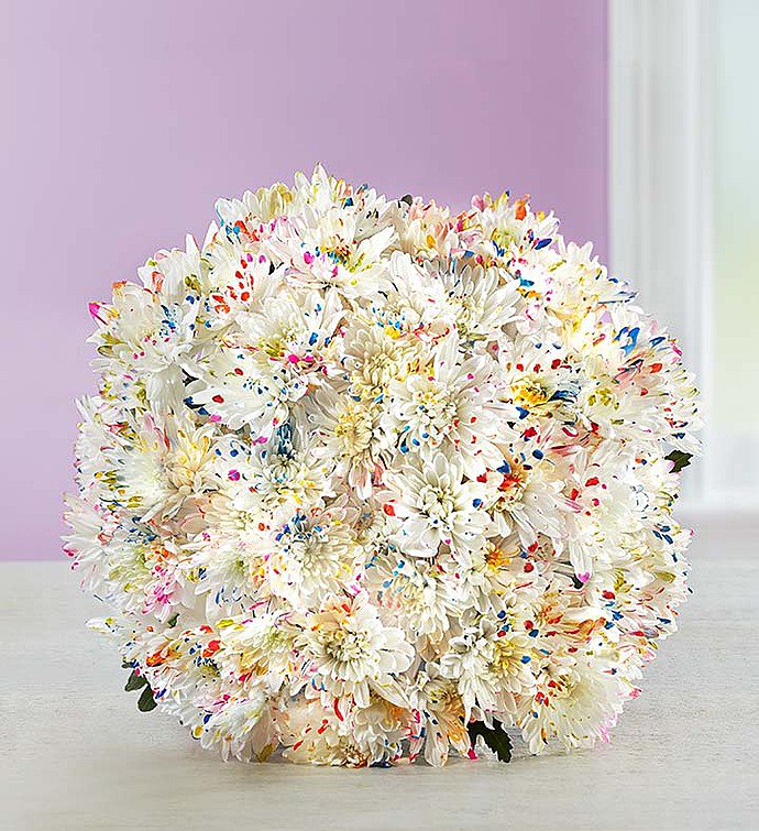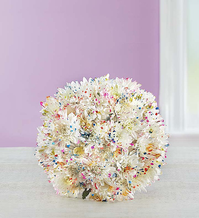 Get the party started with our speckled confetti bouquet! This uniquely festive gift features a bright bunch of white mums, each dappled with brilliant color so that no two blooms are exactly alike. It’s a bright, happy surprise to celebrate someone in a big way.