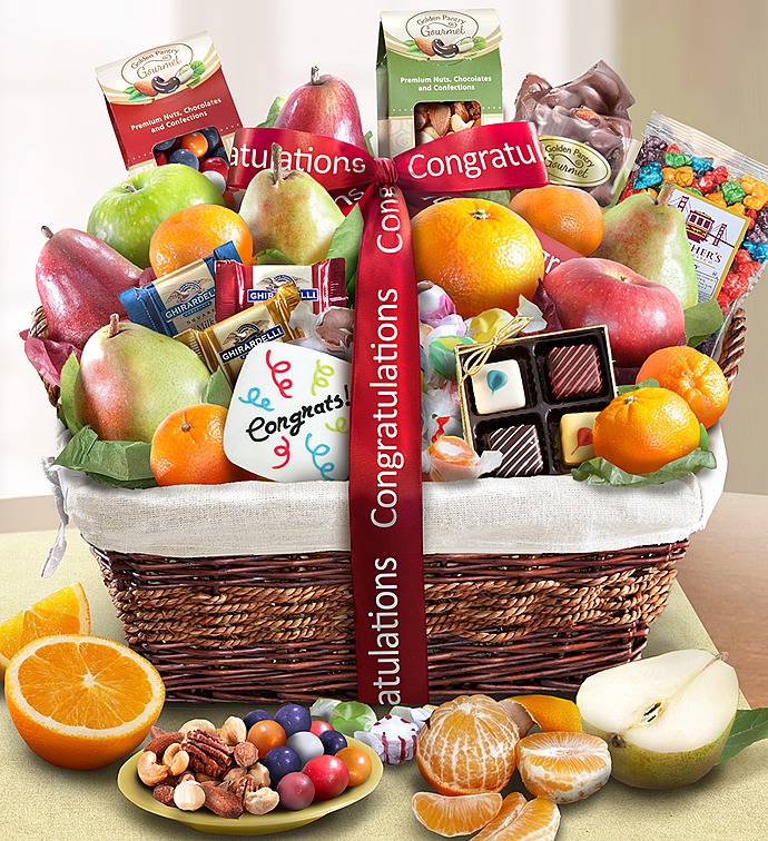 Say Congratulations in a big way when you send this impressive deluxe basket filled with premium quality gourmet foods, fruits, and sweets. This handsome basket is tied with a Congratulations satin ribbon and is filled with six types of fresh fruit, nuts, snacks, chocolate and much more. Make it a gift they'll remember!