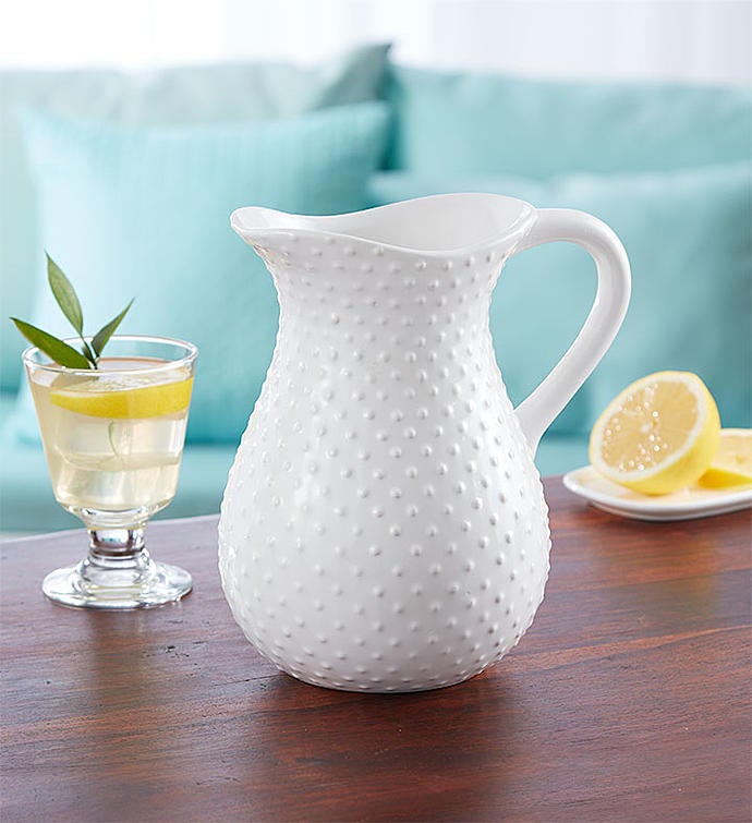• Artistically designed in our exclusive, keepsake “Timeless Treasure” pitcher crafted of white ceramic, featuring a Swiss Dot fabric design that gently wraps around the soft curves; food-safe; arrives with a simple, 3-step Southern Sweet Tea recipe; measures 8"H x 6"D
