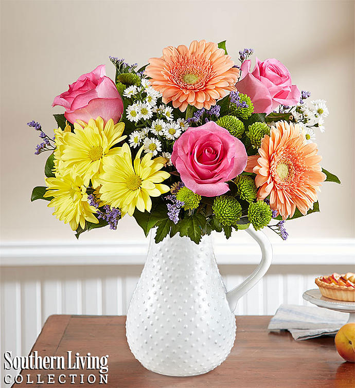 EXCLUSIVE Pour on the Southern charm with our sunny, springtime bouquet. Brought to you exclusively through our partnership with Southern Living, this loosely gathered arrangement is filled with pretty, pastel blooms for a rustic, country cottage feel. It’s hand-designed inside our new Timeless Treasure pitcher, an elegant piece that inspires nostalgia with its vintage, Swiss Dot fabric design. Including a simple Sweet Tea recipe (a staple of the South), it’s the perfect keepsake for displaying or entertaining.