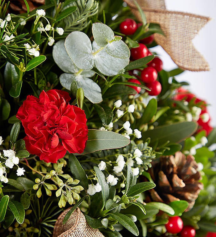 EXCLUSIVE An even cozier version of our perennial favorite, this year’s holiday flower tree delivers big on warm, country charm. Set in a natural wood-grain cube planter, our compact tree is handcrafted of fragrant evergreens with red blooms and trimmed with faux berries, pinecones and a bow of rustic burlap ribbon for a charming twist on traditional.