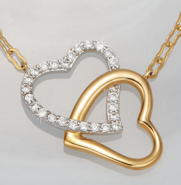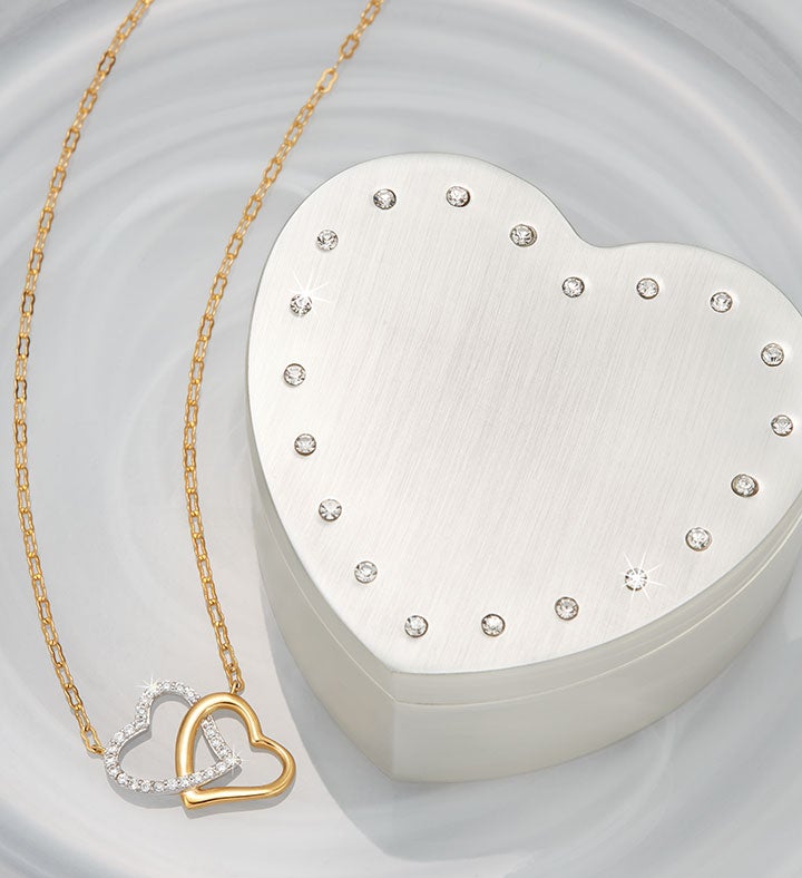 EXCLUSIVE Capture your enduring love and unity with our stunning double-heart necklace from Crislu. Crafted in sterling silver, and finished in pure platinum and 18K gold, it’s a one-of-a-kind gift for the important celebrations and everyday, romantic moments. To keep this special keepsake safely tucked away, add our heart-shaped jewelry box, featuring sparkling crystal accents.