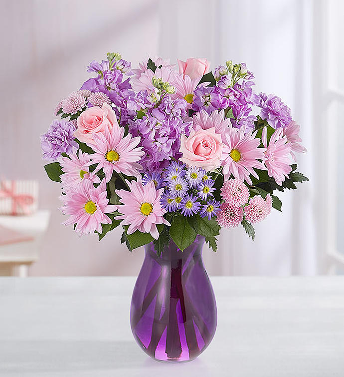 EXCLUSIVE Just like a daydream, our delightful lavender bouquet is a gift that will linger on their mind. Hand-gathered with pops of pink and lush greenery, it arrives in our striking violet purple vase to capture its rich beauty, along with the thoughtfulness of your sentiment.