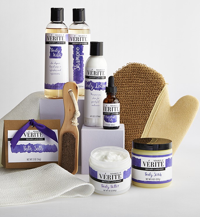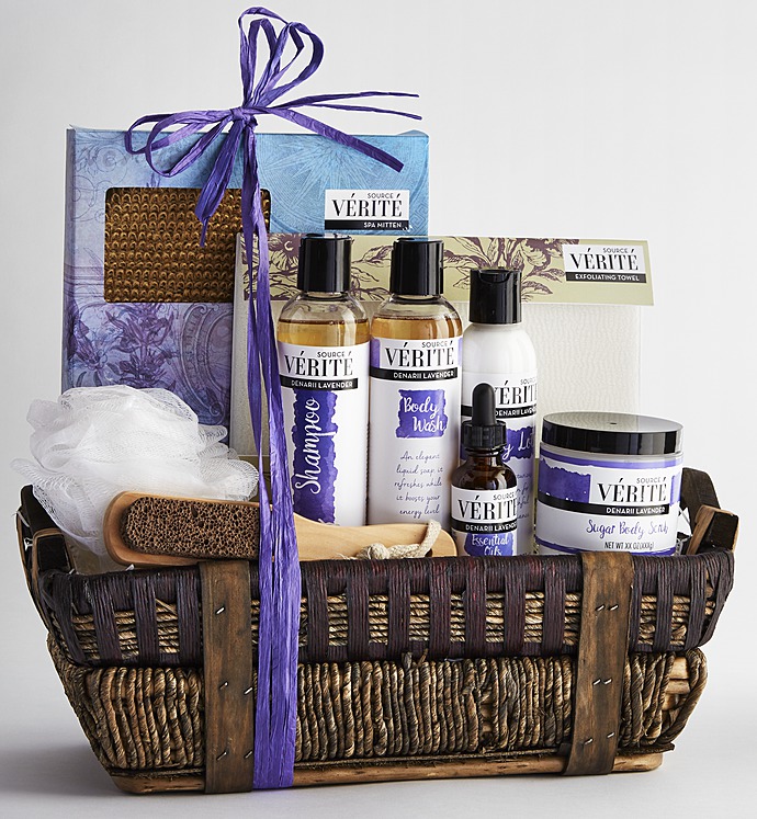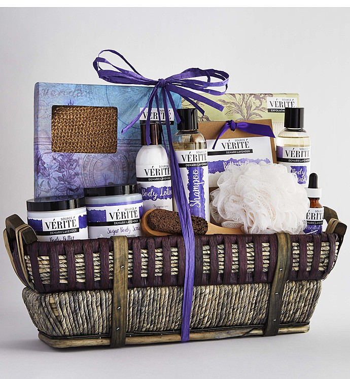 Send her an indulgent spa experience right at home with this exquisite spa gift basket featuring Source Vérité Denarii Lavender products. Known for its fresh floral aroma and naturally soothing properties, lavender has been used for relaxation and restoration since ancient times. With a sophisticated and subtle blend of sweet lavender with natural basil and rosemary, Denarii Lavender products are carefully crafted in the U.S.A. to nurture both body and spirit—so divine you may want to order one for yourself, too!