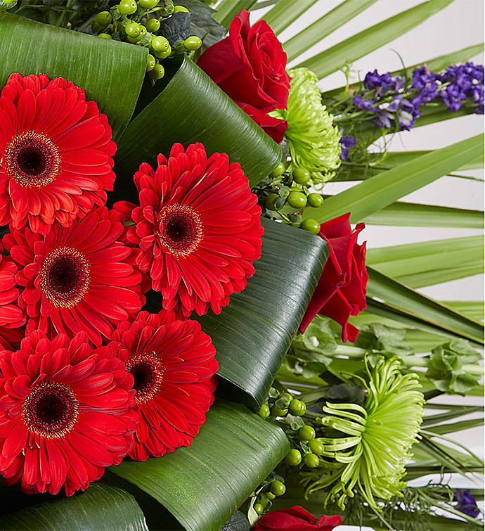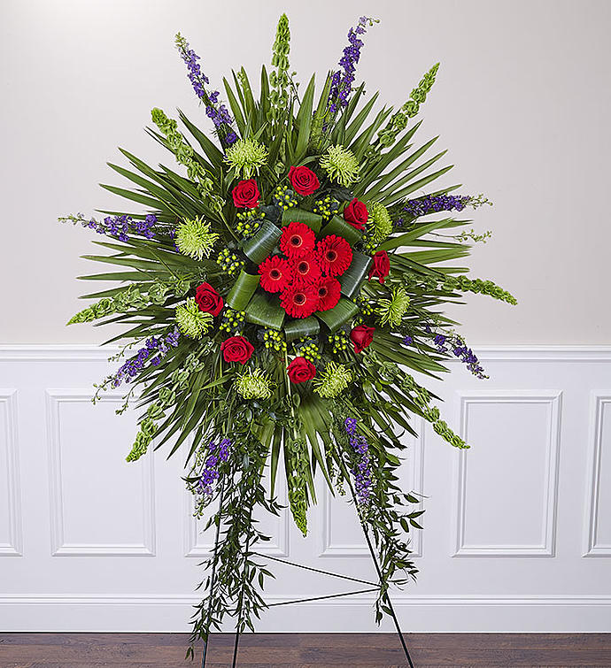 When it’s for the one who always radiated warmth and beauty, no ordinary tribute will do. Our Divine Tribute standing spray is a glorious display, indeed. A grand arrangement of vibrant reds, purples and tropical greens in a dramatic radiating design, it features cascades of trailing ruscus for striking accentuation. A truly divine expression of your condolences.