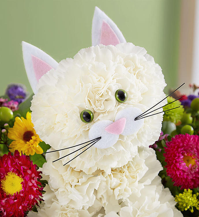 EXCLUSIVE The cat’s out of the bag! Inspired by the success of our best-selling a-DOG-able® collection, we’ve created the purr-fect surprise for feline lovers of all ages. Crafted from white carnations and a mix of colorful blooms inside a charming handled basket, this truly original kitten earns every “aww” it gets.