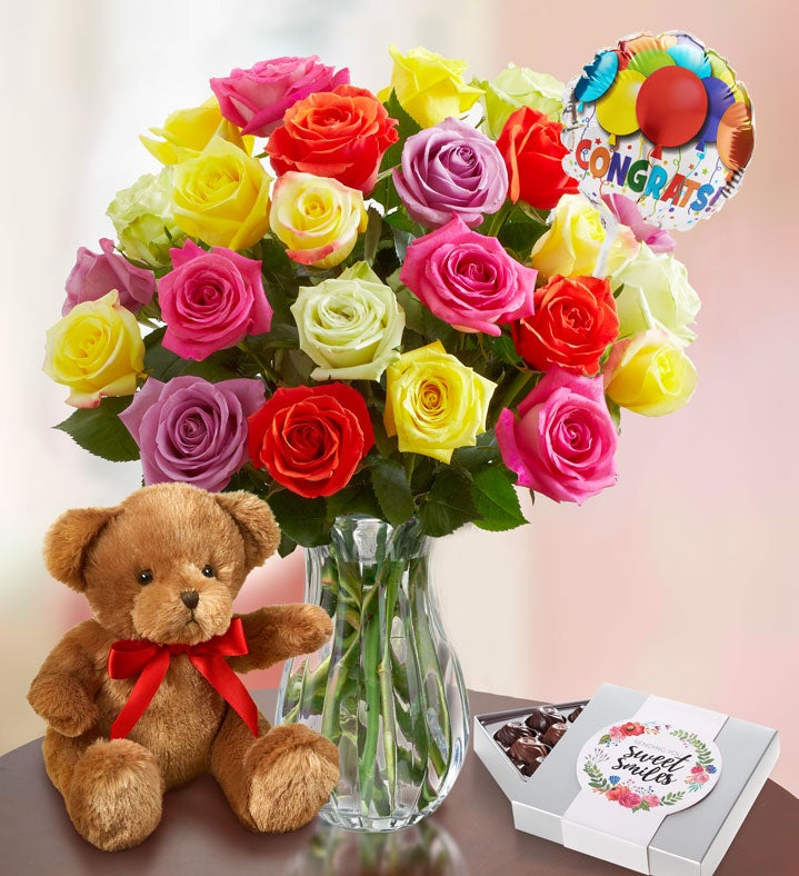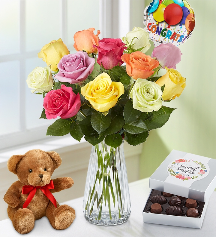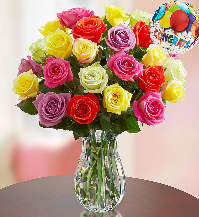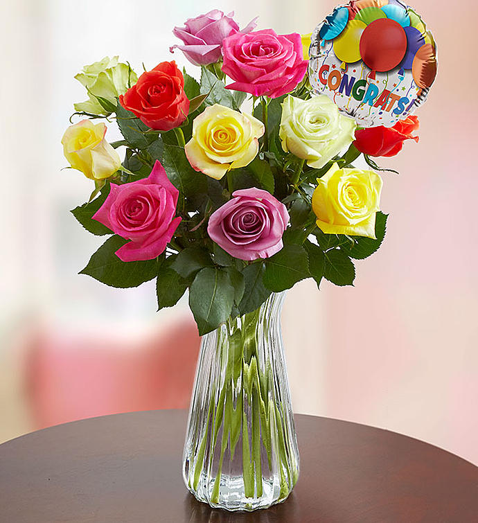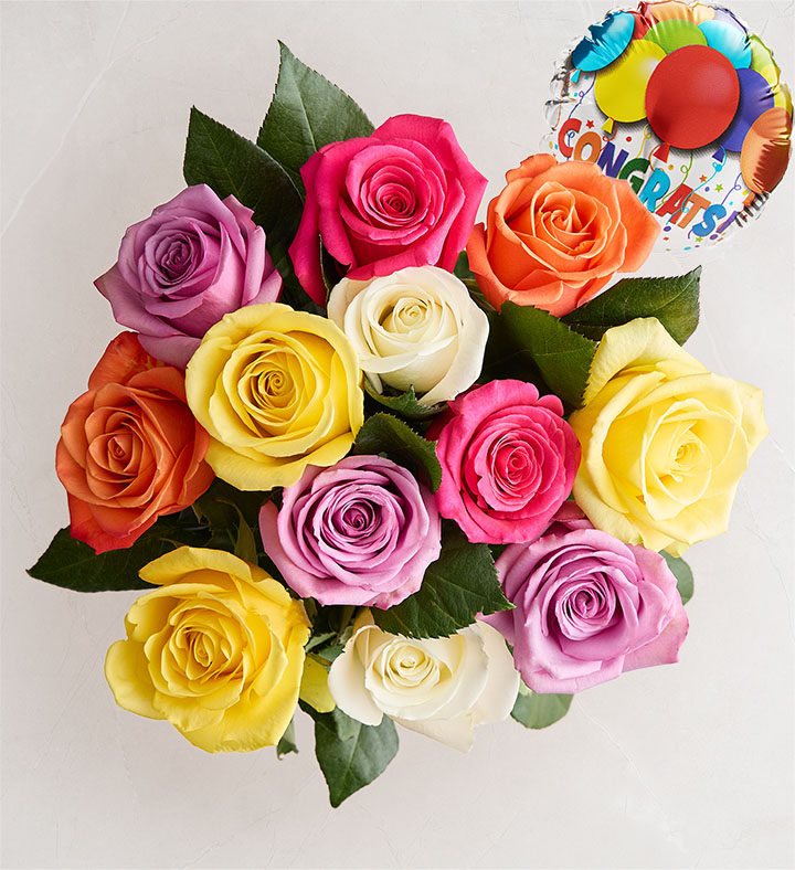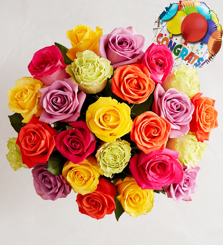 Send praise and well-wishes with our rainbow of roses. A festive “Congratulations” balloon completes this thoughtful gift to celebrate their special accomplishment.