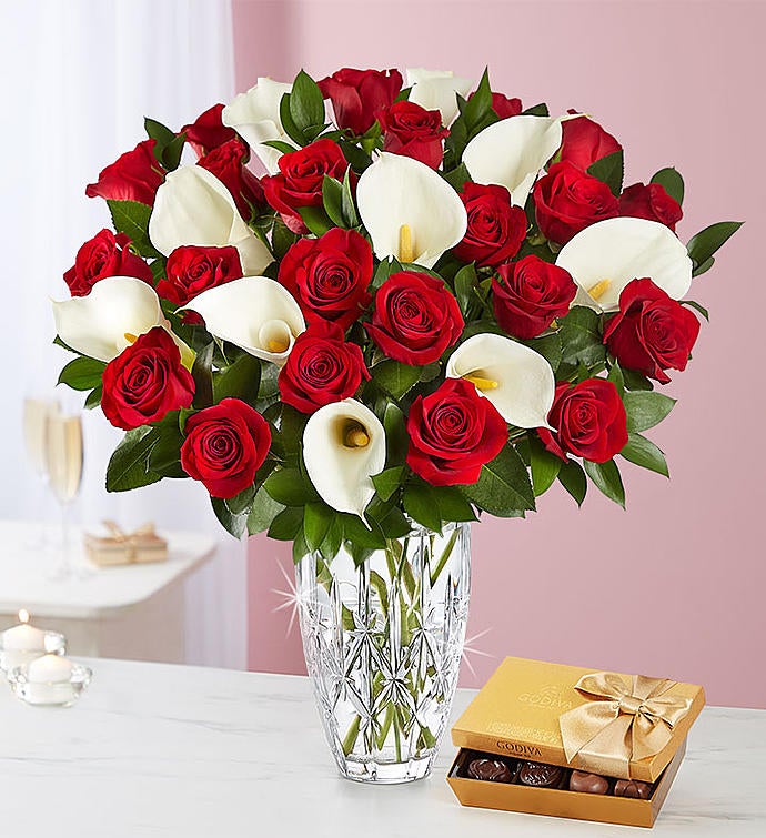 A perfectly luxurious pairing for your perfect match: two dozen long-stem red roses with one dozen pristine white Calla lilies gathered in our classic Marquis by Waterford crystal vase. Full of timeless elegance and romance, it’s just the gift to make someone feel loved.
