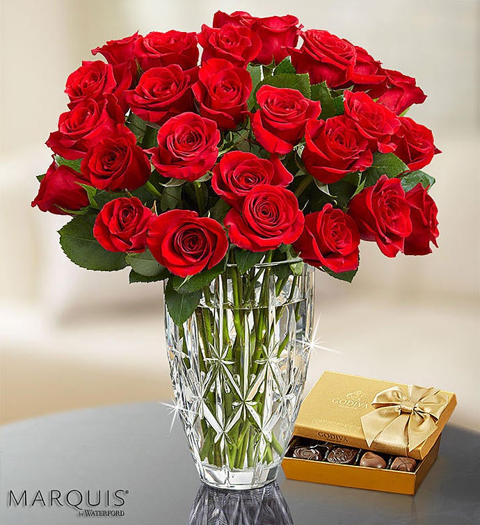 The ultimate gift of luxury: two dozen classic red roses in our dazzling Marquis by Waterford crystal vase. Crafted in the stunning Sparkle pattern, this premium vase features deep, elongated cross cuts for a touch of dazzle. It’s a keepsake they’ll cherish for years to come.