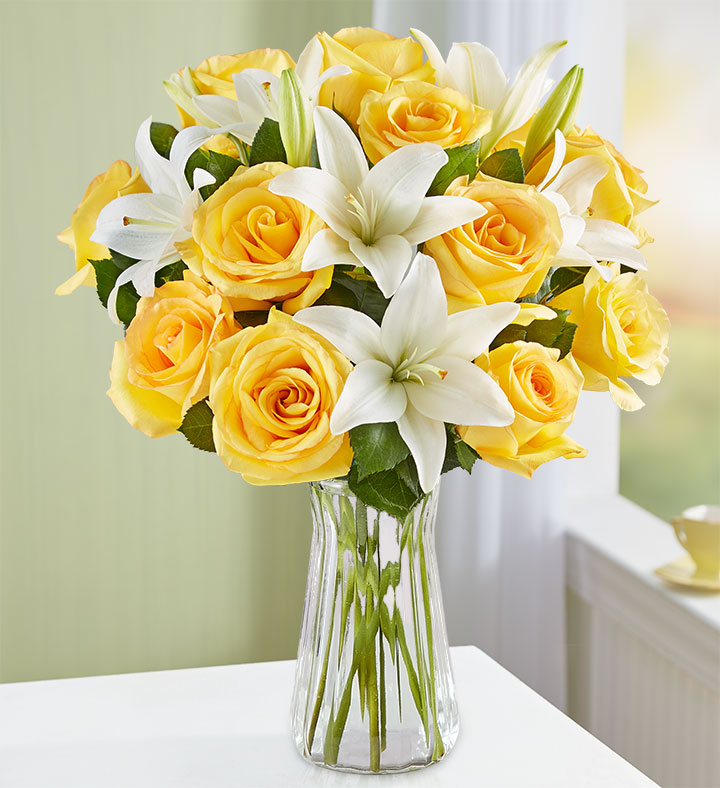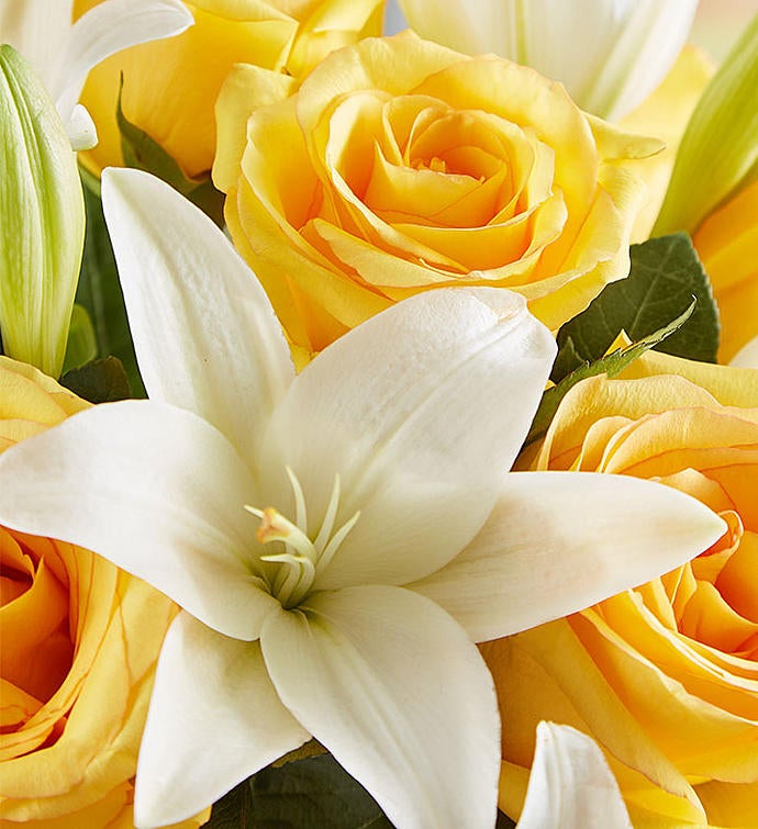 A dozen of our freshest yellow roses and a trio of pristine, white lilies create an irresistibly elegant bouquet that is simply lovely.