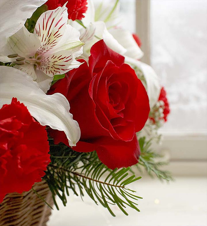 Spread holiday cheer with our fresh-picked basket of blooms. Capturing the natural beauty of the European countryside, this hand-gathered arrangement is designed in signature Christmas colors. A joyful surprise for family & friends; a charming centerpiece for a season of celebrating.