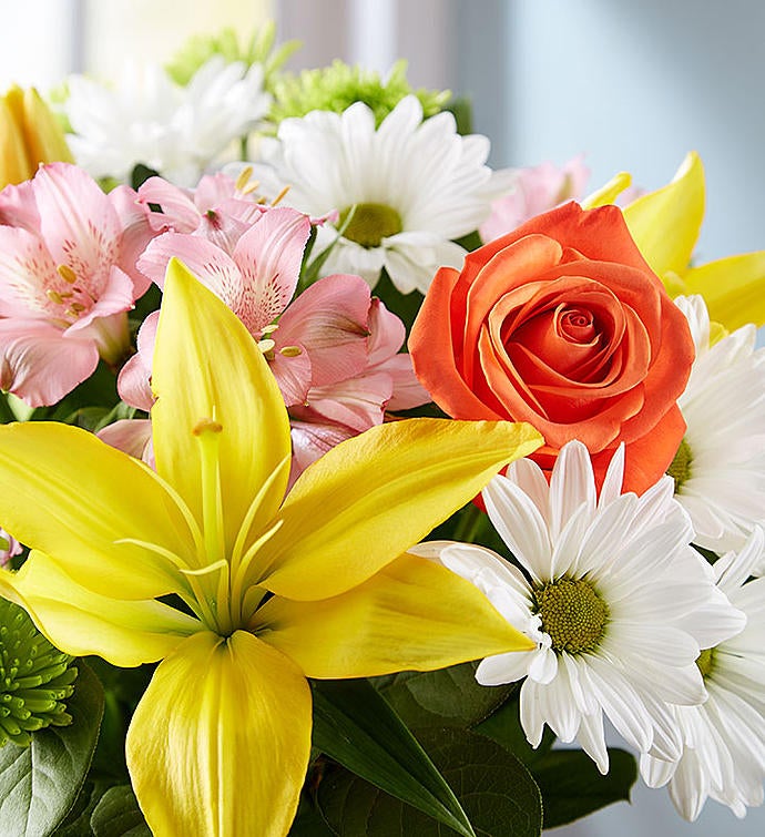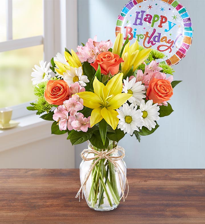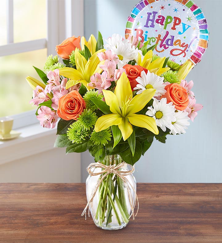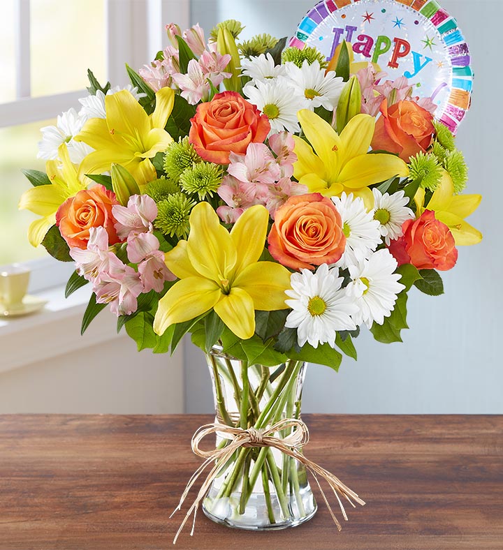 Brighten somebody’s birthday with our beautiful best-selling arrangement. Inspired by the hand-tied bouquets found in European flower markets, this festive gathering of blooms, designed inside a glass vase and tied with raffia, is paired with a cheerful balloon to take their celebration to new heights.