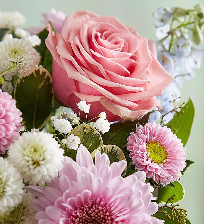 EXCLUSIVE Our new Floral Melody arrangement will have them singing a happy tune. A medley of blush-colored blooms come together inside our striking white glass mosaic vase, featuring a diagonal pattern that dazzles in the light. Later, our exclusive container stands out as a centerpiece or as an eye-catching candle holder…tea light included!