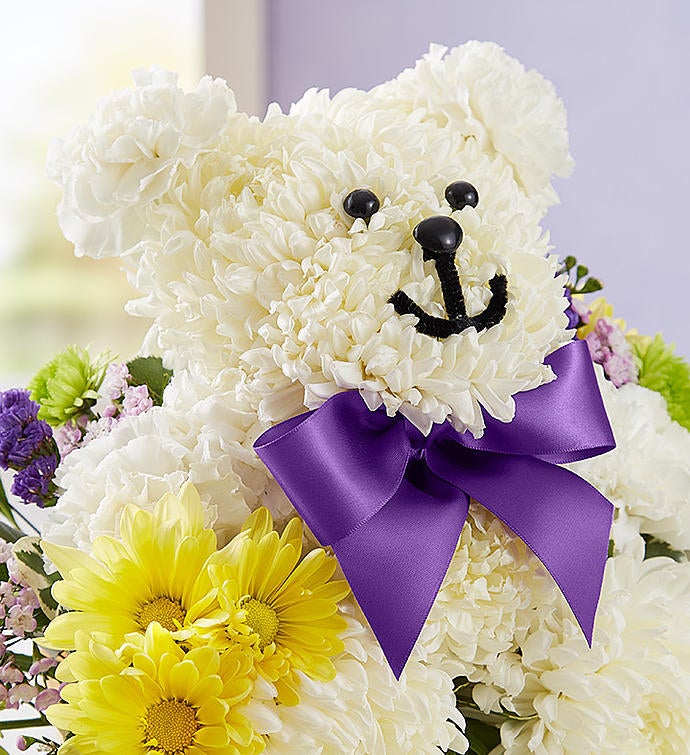 EXCLUSIVE Make someone beary cheerful with our unique bear arrangement! Handcrafted from fresh white blooms, our adorable cub arrives in a charming basket filled with a vibrant mix of flowers. Holding his own little bouquet of yellow daisy’s, and finished off with a purple satin bow, our truly original bear is a sweet way to show how much you care.