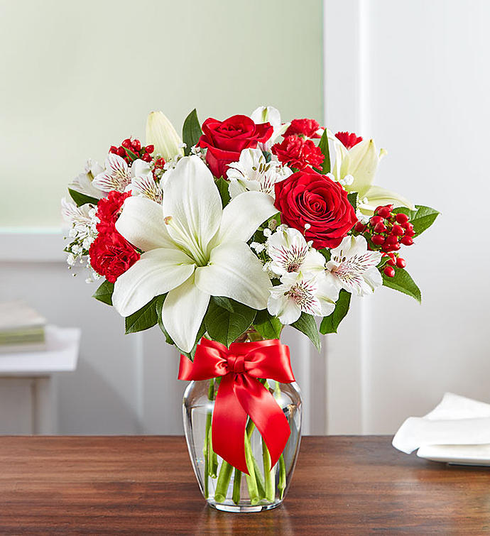 Being greeted at the door by a stunning bouquet of vibrant red and white… now that’s bliss. Our radiant roses and lush lilies are gathered in a classic glass vase and wrapped in red ribbon for added charm. Whether you want to brighten their birthday, make an anniversary memorable, or just remind them how much you care, this arrangement will add joy to their day!