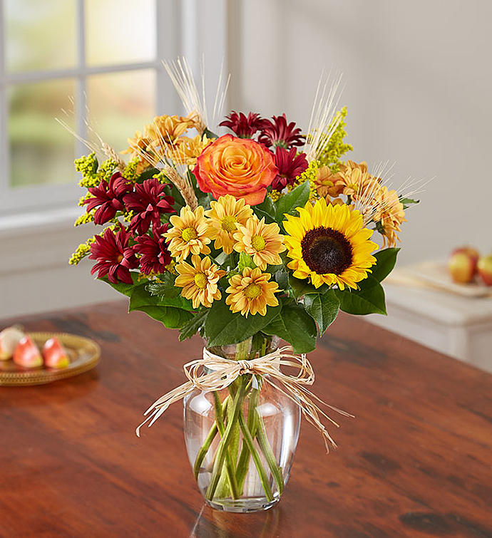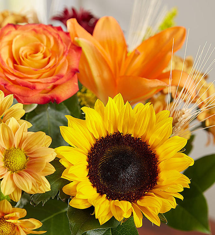 • All-around arrangement with autumn-colored roses, sunflowers, orange Asiatic lilies, red and autumn-colored daisy poms; accented with wheat, solidago and assorted greenery