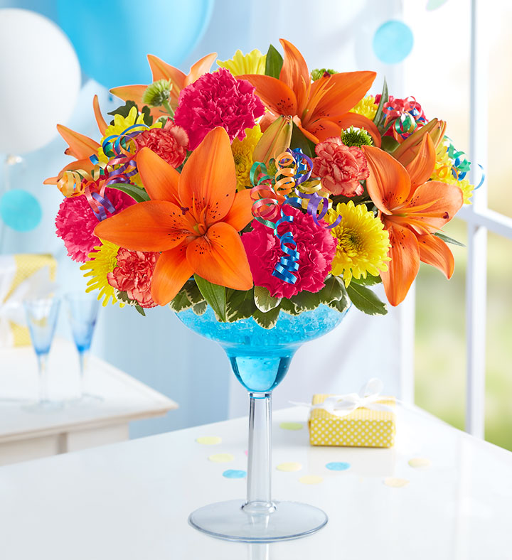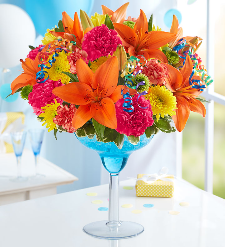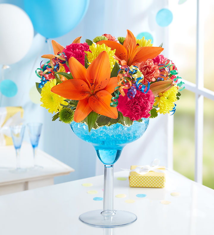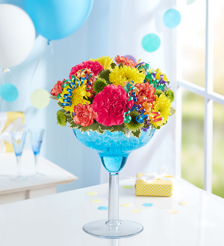 EXCLUSIVE It’s somebody special’s birthday. Serve up some fun with our celebratory flower cocktail. We’ve hand-designed a vibrant mix of blooms inside an oversized margarita glass, creating a truly original a gift fit for a party. Cheers!