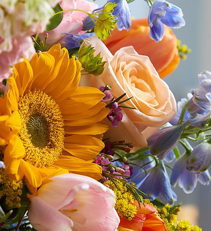There’s so much to love about spring…but it’s the bright, beautiful blooms that make it truly sensational! Our cheerful bouquet features a garden-style mix of pink, blue, yellow and peach blooms. Artistically hand-designed, it’s a gift that delivers the best part of the season right to their door.