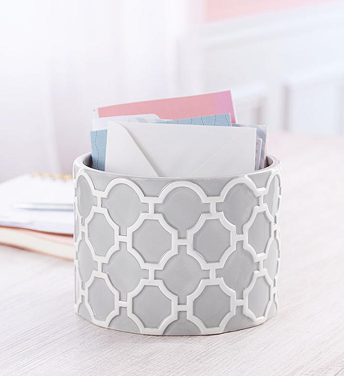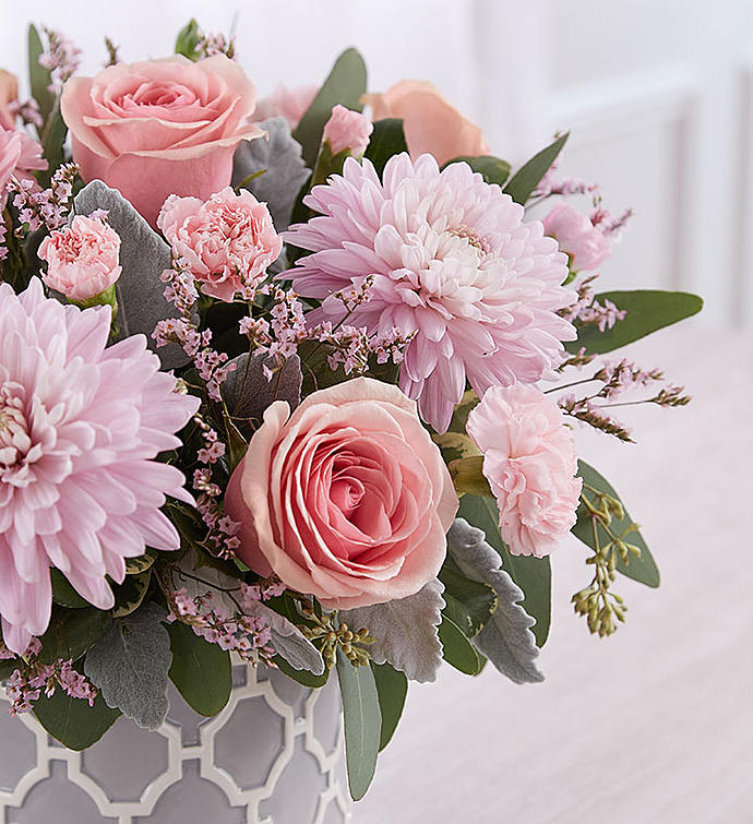EXCLUSIVE Style and sophistication come together to beautifully express your sentiments. Created exclusively through our partnership with Real Simple®, this moderns-meets-feminine design flaunts an abundance of blooms in soft pink and lavender. Adding to the chic, contemporary feel is our geometric cylinder vase, featuring an iconic embossed pattern accented in soft gray & white. With its clean lines, this unique, textured piece is one they’ll turn to time and time again.