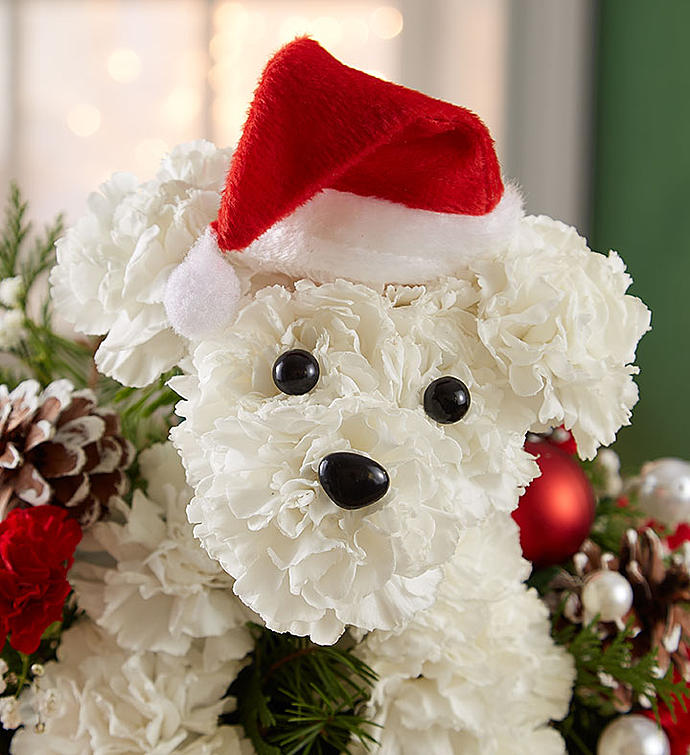 EXCLUSIVE Who’s that doggie dashing down the chimney? It’s our very own Santa Paws! Hand-crafted from a merry mix of blooms and ornaments, and decked out in a festive Santa hat, our favorite holiday pup is perched inside an exclusive, snow-topped chimney container, ready to unleash Christmas cheer on family and friends.