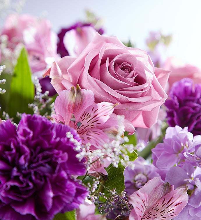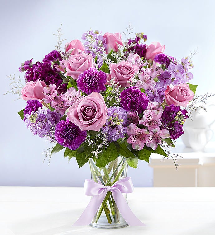 Every shade of purple in our radiant bouquet will bring joy & delight to the people you love. A rich gathering of blooms, hand-arranged by our skilled florists with lush greenery inside a glass vase, tied with ribbon. One look will be all it takes to turn their day around!