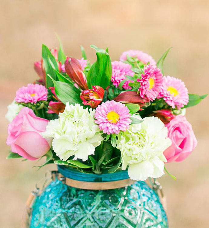 LOCAL ARTISAN Country charm meets global chic. That’s how we describe the sweet floral bouquet created by Ann Marie Pierce from 1-800-Flowers Imperial Florist in Baldwin, New York. A mix of fresh blooms in soft shades of pink & green, offset by the splash of blue color from our exclusive new globe vase. Inspired by the blue water of the Mediterranean Sea, this striking, globe-shaped glass bowl features an antique pressed design and rustic rope handle. The added tea light candle turns it into a gorgeous candle holder after the flowers are gone.