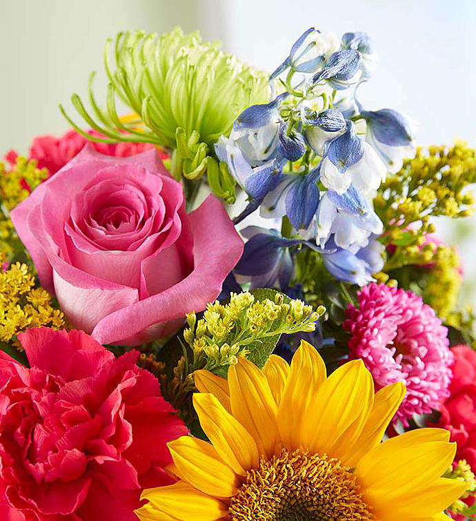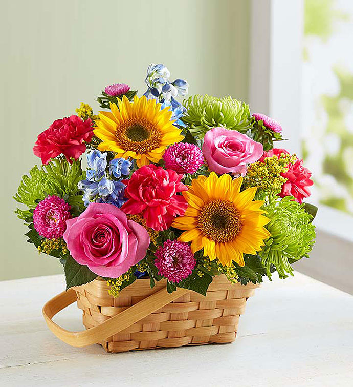 There’s so much about a garden to inspire—vibrant colors, sweetly scented blooms... and that’s why we’ve captured it all in one charming basket! Filled with a beautiful mix of roses, sunflowers, daisies, and more, our hand-designed arrangement will inspire them to smile brighter, laugh longer... and delight in the moment forever.