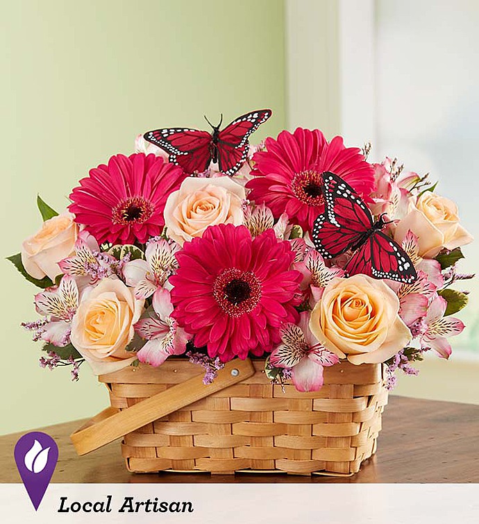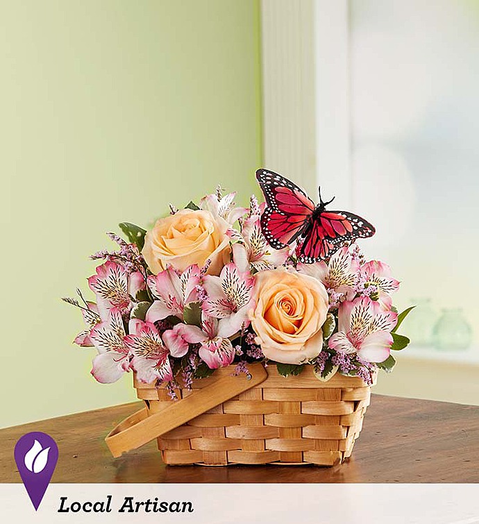 LOCAL ARTISAN Thoughts of warm spring days inspired floral designer Wendell Cook from 1-800-Flowers | Nancy’s Floral in Gresham, OR to create this beautiful and vibrant arrangement. A rustic handled basket holds a delicate mix of pink and peach blooms for plenty of color and charm. And what better finishing touch than a playful butterfly to bring a little extra whimsy and delight to somebody’s day!