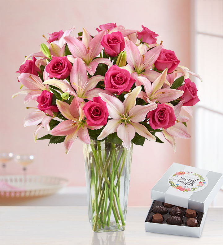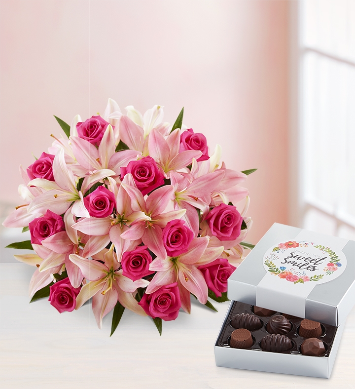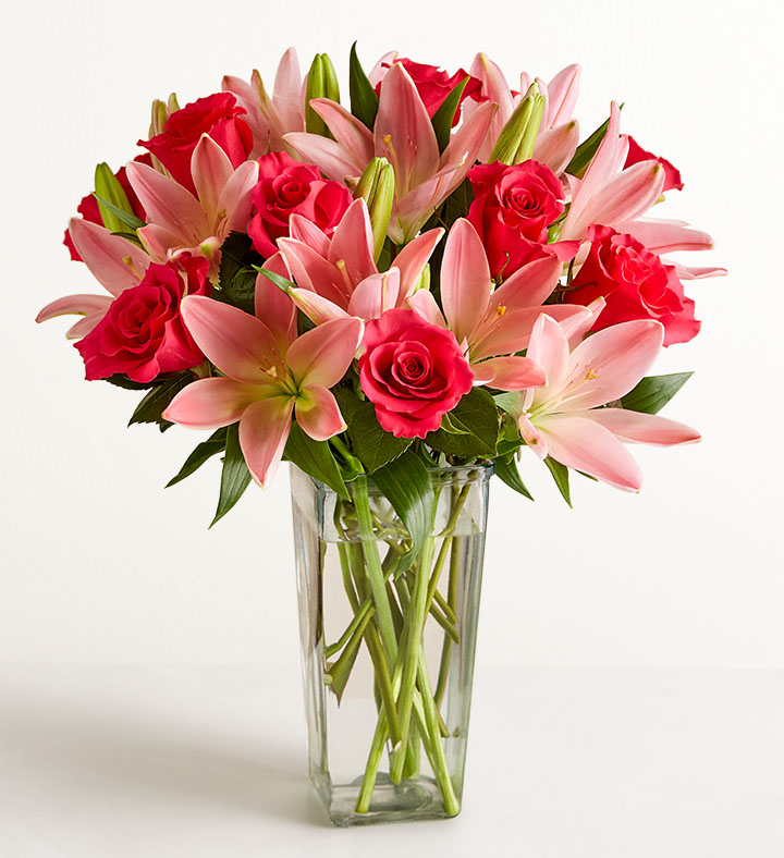 Magnificent is the only way to describe our all-pink bouquet. We’ve gathered one dozen long-stem roses with six, multi-bloomed Asiatic lilies for a gift that’s sure to make an impression.