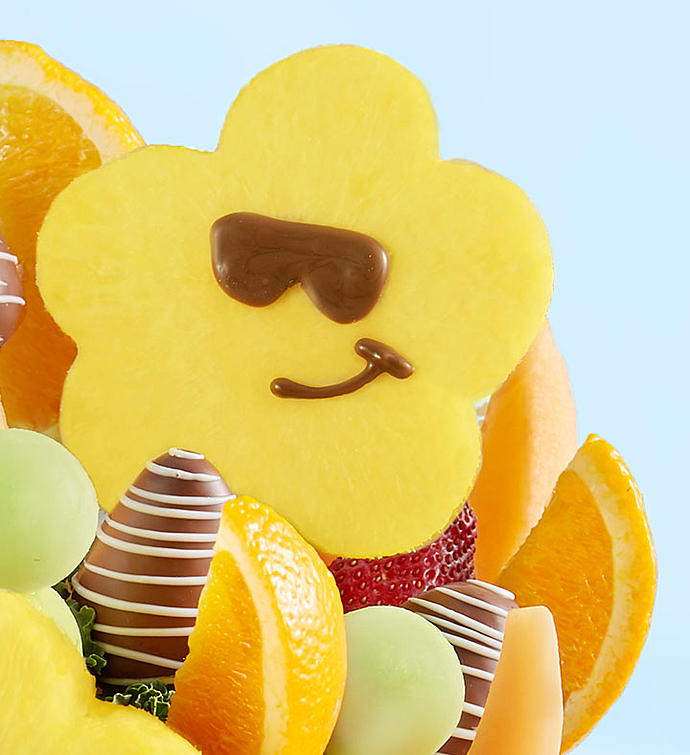 Caution: contents are delicious! Our sizzling sweet treat brings the fun & yum, with daisy-shaped pineapples in sweet sunglasses. Juicy strawberries, oranges and melon get into the mix, making this fun fruit creation the most unique & tasty one under the sun.