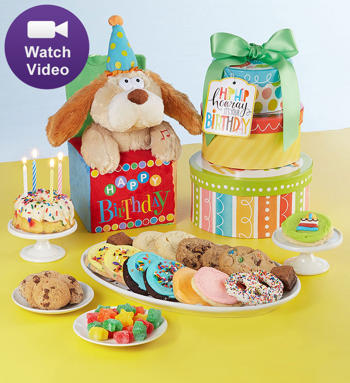 For an instant party, just add our all-in-one birthday bundle! Up first to make them happy is “Flappy,” our animated plush dog, who moves & grooves to the Beatle’s classic “Birthday” song. Keep the fun going with our colorful confetti party popper that’s always a blast. And for a sweet finish, treat them to our three-tiered tower filled with delicious favorites, including Cheryl’s famous buttercream cookies and miniature cake, complete with candles, to make a wish. It’s the ultimate way to celebrate their big day.