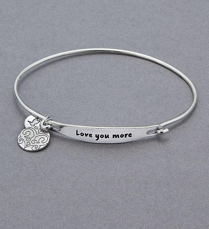 Want to see them flash that smile you first fell in love with? Surprise a loved one with our beautiful Chamilia bracelet. This lightweight sterling silver bangle features the sentiment “Love You More,” and includes a decorative hanging charm. Makes a wonderful Valentine’s, birthday or anniversary gift…or an out-of-the-blue romantic gesture.