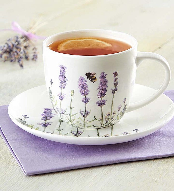 Here’s a delightful gift for the tea lover in your life! Part of our “Love Lavender” collection, it includes a porcelain tea cup and sauce set with a charming graphic of bees dancing from flower to flower in a lavender field. We’ve paired it with Harney and Sons® signature tea, featuring an enticing caffeine-free blend of chamomile, lavender and cornflower. It’s a relaxing and indulgent gift, sure to make them smile!