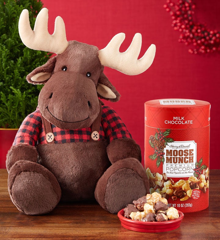 EXCLUSIVE Cuddle up for winter with Jasper the Moose…and a delicious treat! Our adorable Harry & David plush is paired with their signature Moose Munch caramel and milk chocolate popcorn. The perfect 2-in-1 gift for days spent relaxing and snacking.